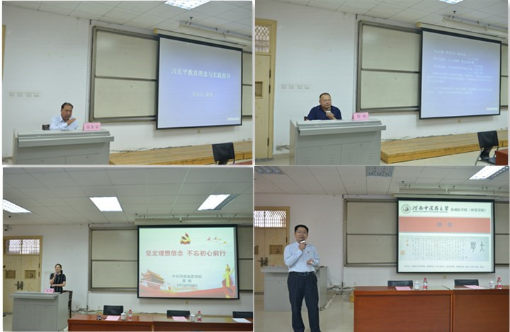 开幕式后,河南财经政法大学统计与大数据学院党委书记徐金安教授和社会学院陈锋教授共同作了题为《习近平总书记教育理念与实践指导》的专题讲座,中共河南省委党校党史教研部周楠副教授和禄保平分别以《坚定理想信念不忘初心前行》《修德明理 守正崇廉》为题,深入解读了习近平新时代中国特色社会主义思想及习近平总书记教育理念,提高了党员的思想政治认识,引导广大教师结合中医传统文化开展课程建设,坚定了全体党员为实现共产主义奋斗终生的理想信念,对全面从严治党、党风廉政建设向纵深开展起到了积极的推动作用。