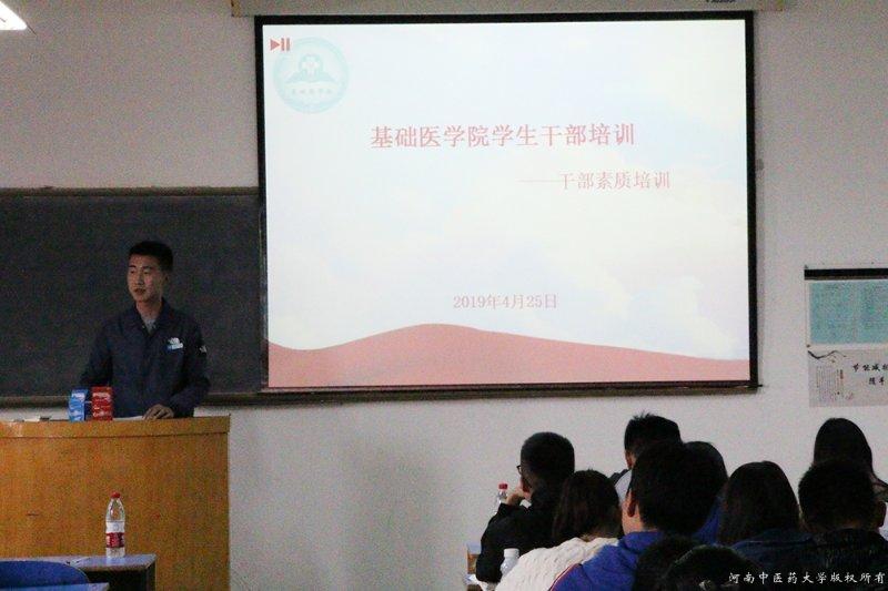 (图:李康;文:闫辉)为进一步提高我院学生干部的综合素质,增强学生干部的责任意识,促进专业技能养成,4月25日中午,基础医学院在A441教室举办第三次学生干部培训,本次培训会特邀我校社团联合会主席郭威振,团员小筑班班长、康复医学院分团委学生兼职副书记朱铖育为我院学生干部分享经验、解答困惑。2018级新生辅导员闫辉老师和全体学生干部成员参加此次培训。
