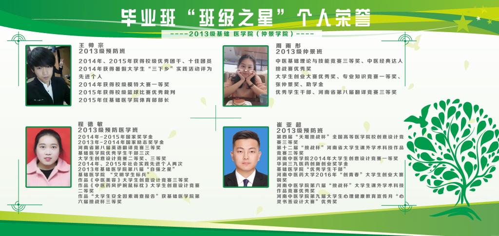 4名毕业生班级之星中,2013级预防医学本科班3名,2013级仲景学术传承班1名。他们分别是:荣获国家奖学金、国家励志奖学金、河南省第八届英语翻译竞赛三等奖、优秀学生干部、优秀团员、军训先进个人、大学生创意设计竞赛三等奖、大学生创意设计竞赛二等奖、社会实践先进个人、基础医学院第八届“自强之星”、基础医学院文明学生标兵、第六届挑战杯三等奖等荣誉的2013级预防班程德敏同学;荣获第四届“天堰挑战杯”全国高等医学院校大学生中医药创意设计竞赛三等奖、第十二届“挑战杯”河南省大学生课外学术科技作品竞赛三等奖、2014年大学生创意设计竞赛一等奖、军训先进个人、华润三九医药创新创业奖学金、优秀团员、优秀学生干部、2016年“创青春”大学生创业大赛铜奖、第六届“挑战杯”大学生课外学术科技作品竞赛优秀奖等荣誉的2013级预防班崔亚超同学;荣获校级优秀团干、十佳团员、暑假大学生“三下乡”实践活动先进个人、校级模特大赛一等奖等荣誉的2013级预防班王帅宗同学;荣获校中医基础理论与技能竞赛三等奖、中医经典达人挑战赛优秀奖、大学生创业大赛优秀奖、张仲景奖、助学金、优秀学生干部、河南省第八届翻译竞赛三等奖等荣誉的2013级仲景班周雨彤同学。