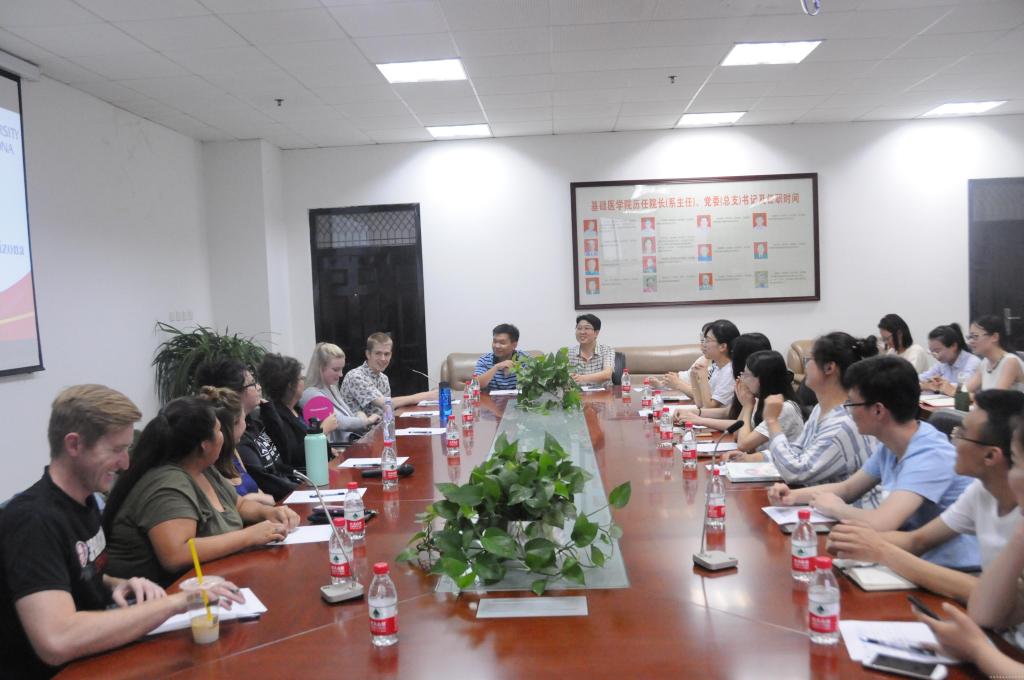 交流会伊始,徐书记对亚利桑那大学同学的到来表示了热烈欢迎,热心为其讲解了基础医学院概况和人才培养情况,并鼓励中美青年大学生积极交流。随后,我院预防医学专业学生就中美之间大学生活差异、专业课的区别、实习和毕业后的就业方向等内容与美国学生进行了深入的交流。对我院学生提出的问题,美国同学都给予了热心、真的回答,交流过程中他们对我院同学的英语口语能力表示赞赏。最后,双方又就“如何看待男女比例不平衡”“中美食物之间的差异”等课外话题展开了热烈的讨论,交流持续三小时,双方学生兴致勃勃,意犹未尽。