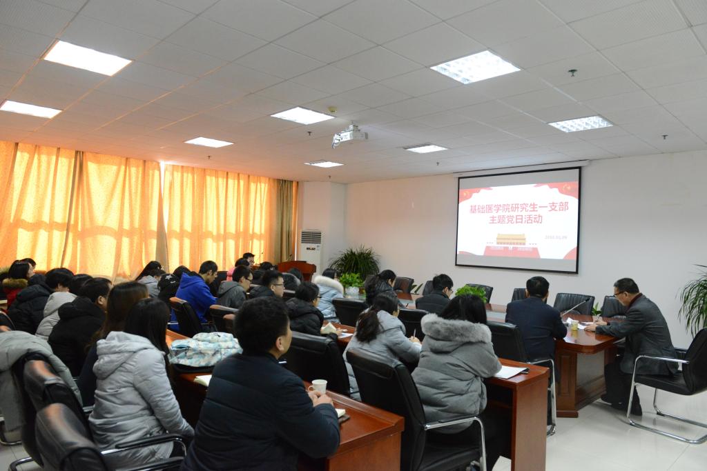 为深入学习贯彻党的十九大精神,2018年1月9日下午,基础医学院研究生第一党支部举行了以“砥志研思,力学笃行”为主题的党日活动。副校长李建生同志、基础医学院党委书记禄保平同志应邀参加,基础医学院研究生第二党支部、第三党支部全体党员也参加了此次活动。