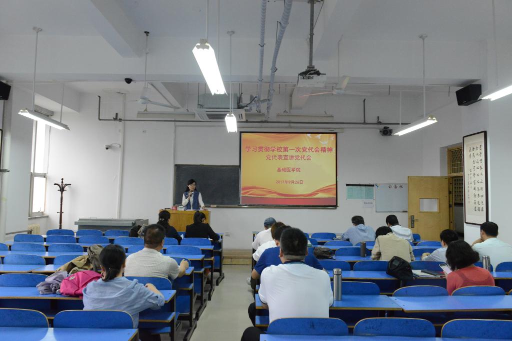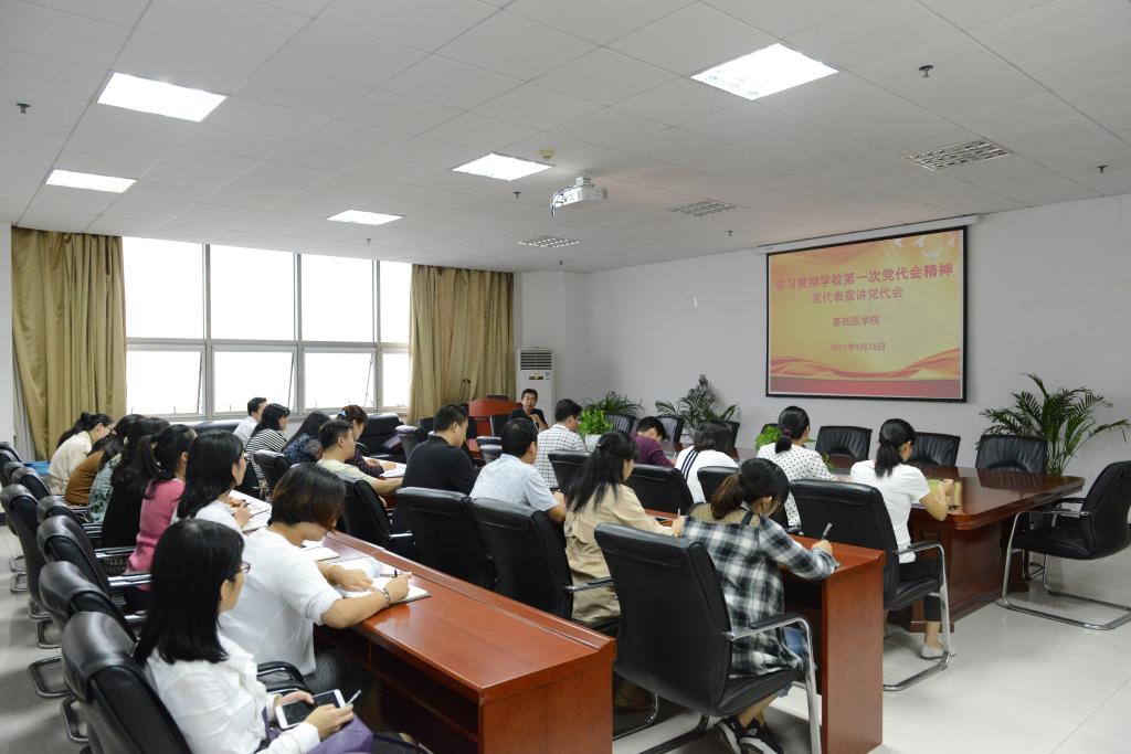 校第一次党代会于2017年8月29日-31日胜利召开,为深入学习宣传贯彻党代会精神,基础医学院班子成员、党代表朱平生、曹珊、高剑峰、李肇进同志于9月26日下午分头到所联系党支部讲党课,宣讲学校一次党代会精神,指导党支部建设工作。