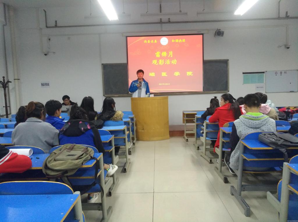 雷锋精神与“奉献、友爱、互助、进步”的志愿精神贯穿于基础学子春夏秋冬的日常实践中。基础医学院青年志愿者协会于 3月6日晚7点在教室A401开展了雷锋月系列活动之观影,通过播放电影《雷锋》以及对雷锋精神的宣讲,使志愿者们接受了雷锋精神的滋养和熏陶, 进一步弘扬了雷锋精神。