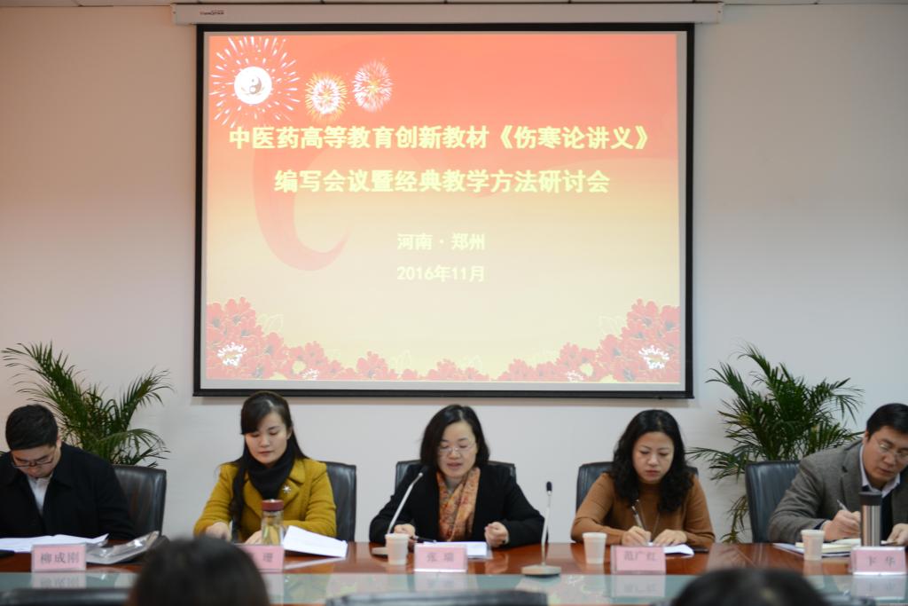 2016年11月26日,中医药高等教育创新教材《伤寒论讲义》编委会暨经典教学方法研讨会在我校新区召开。我校教务处张瑞副处长、基础医学院曹珊副院长、河南科学技术出版社医药卫生分社范广红社长、《伤寒论讲义》编委会成员及我院部分教师代表参加了此次会议。