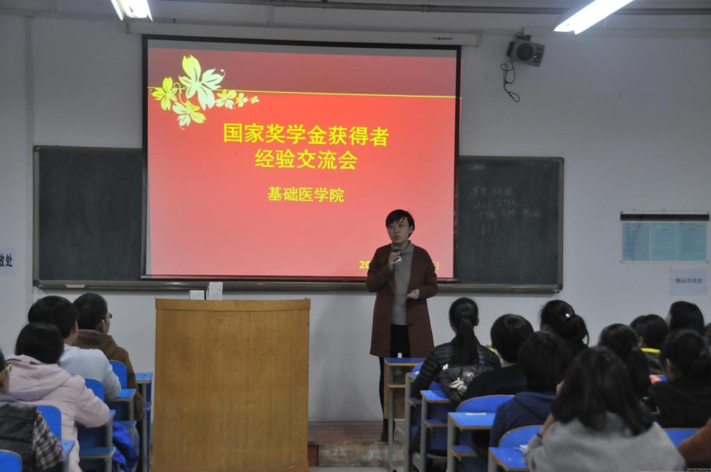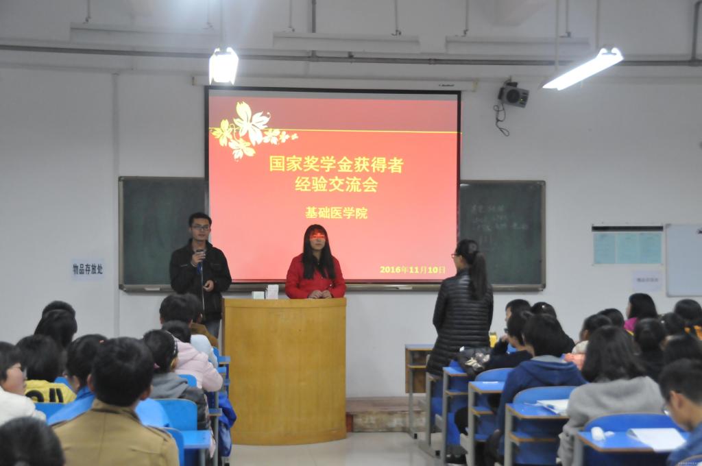 知识改变命运,励志照亮人生。为了使基础医学院莘莘学子了解国家资助政策,明确学习目标,掌握学习方法,做到“会学、乐学、善学”, 11月10日晚7点,我院国家奖学金经验交流会在教学楼A405举行。国家奖学金获得者14仲景田传玺、14预防李宾、资助专员李倩老师和各班代表共140余人参加此次会议。