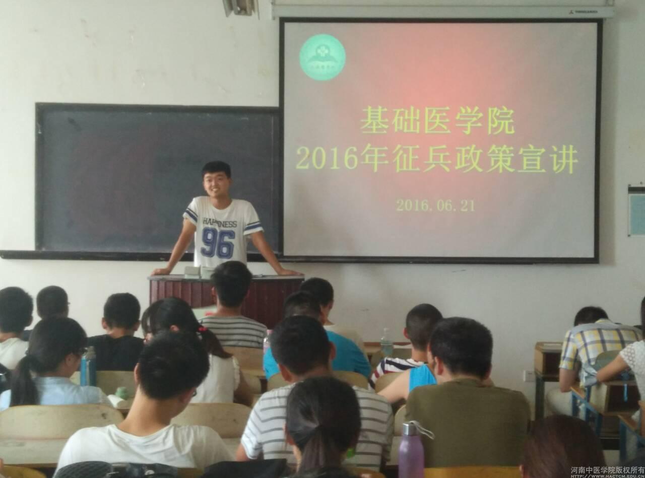 为帮助我院学生了解当前我国关于大学生应征入伍的优惠政策与应征流程,激发基础医学院在校大学生参军热情,6月21日起,我院学工办积极动员部署,针对应往届毕业生及在校生开展征兵宣讲活动。