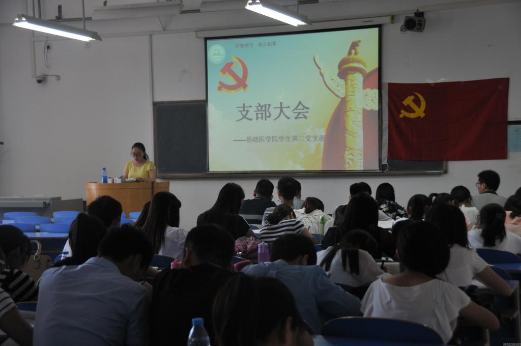 本科生第二党支部第二党支部书记徐里老师首先进行了发言,支部书记徐里首先传达了基础医学院本科生党支部《关于开展“两学一做”学习教育实施计划》,并根据相关内容对全体毕业生党员提出了三点要求:一是深入学习党章党规,牢记党的宗旨和党员的权利及义务,守好为人处世的底线,做到学用结合,知行合一;二是广泛学习系列讲话精神,通过学习要领会系列讲话的内涵和要义,明确中央的新思想新战略,不断提高自身党性修养,永葆党员的先进性;三是做合格党员,发挥好学生党员的先锋模范作用,处处要铭记自己党员身份,立足本职,建功立业,并号召全体毕业生党员要在有限的在校时间内,按照计划认真开展学习活动,以身作则,文明离校,以实际行动带领全体毕业生顺利、愉快地度过毕业季,进入新的岗位后也要坚持不懈学习,开拓进取,勇于创新,在基层岗位发挥党员先锋模范带头作用,为党旗增辉,为母校添彩;随后,全体毕业生党员在支部宣传委员张志恒同学的领学下,重温了入党誓词及《中国共产党廉洁自律准则》和《中国共产党纪律处分条例》。会后各毕业班级党小组组长在支部大会上对本班的学习情况进行了汇报。