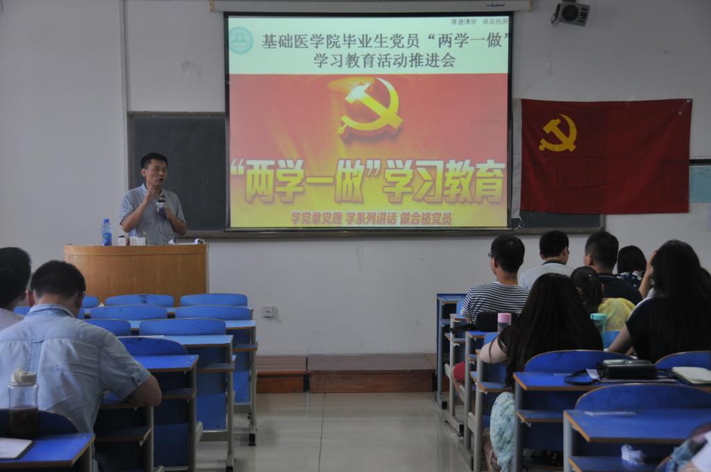 为加强基础医学院2016届毕业生党员教育,积极响应我校党委关于在全校党员中大力开展“两学一做”学习教育的号召,确保2016届毕业生党员在毕业生文明、有序、安全离校中发挥模范带头作用,在新的岗位中建功立业。6月17日,基础医学院开展了毕业生党员“两学一做”学习教育。