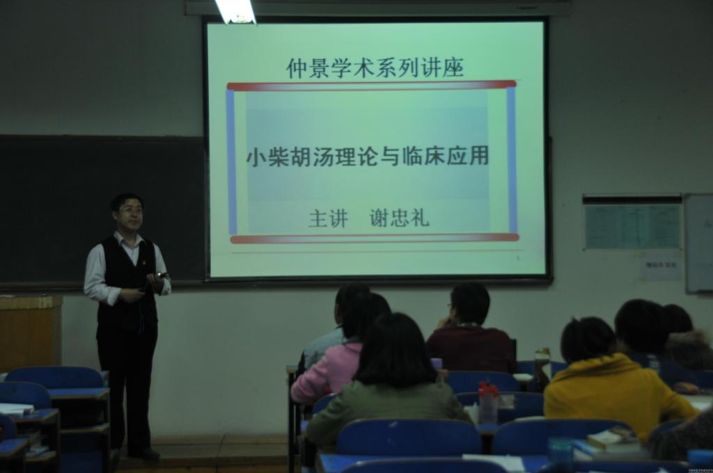 2016年3月31日晚,由基础医学院承办的我校第七届仲景文化节仲景学术思想专题讲座暨基础医学院2016年首期仲景讲坛在新校区教学楼举行,我校伤寒学科谢忠礼副教授做客本次讲坛,并做了题为“小柴胡汤理论与临床应用”的学术讲座,我校百余名学生到场聆听了讲座。