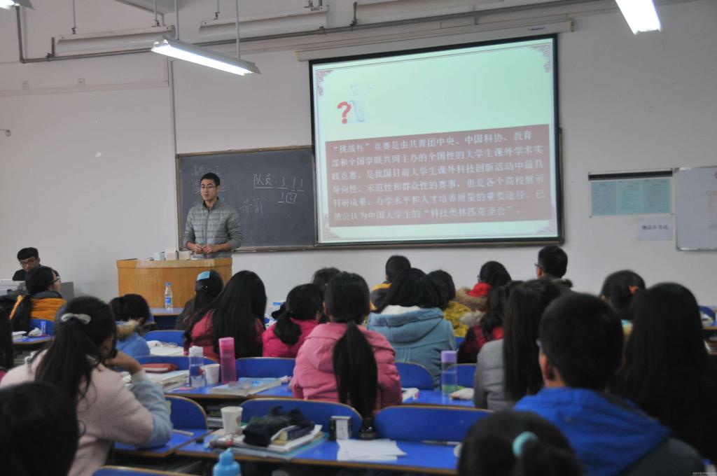 为贯彻落实校团委关于“挑战杯”相关要求,积极开展我院“挑战杯”工作,2015年11月底,由基础医学院分团委副书记刘旭初老师带领学生会科技部谢天祥、王冲等五位同学组成宣讲队,深入基础医学院各班详解“挑战杯”相关事宜。