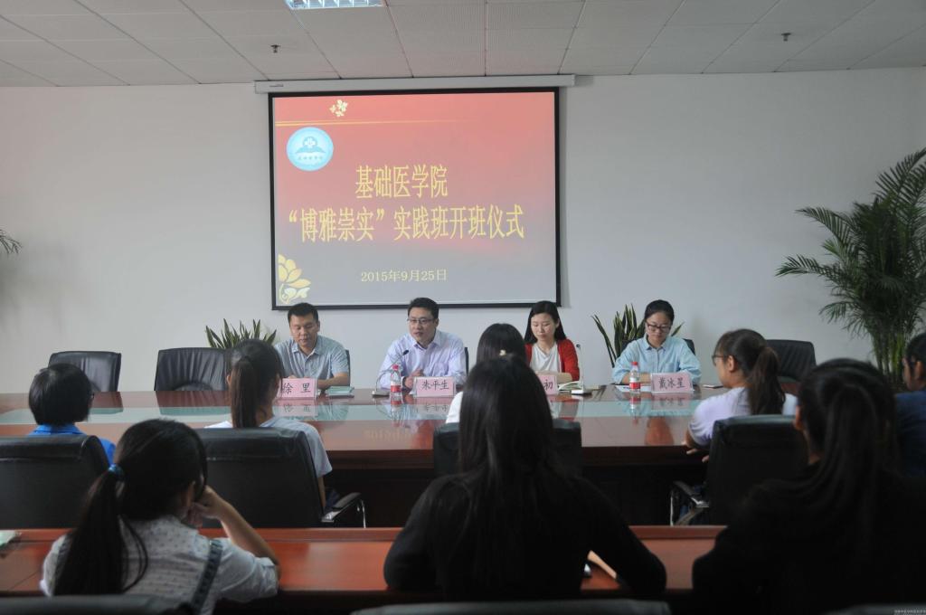 为培养一批知识水平高、专业性强、综合能力突出的当代大学生,以及响应校团委关于在各院系组建精英班的号召,我院首期“博雅崇实”实践班于9月25日开班。基础医学院党委副书记朱平生、学工办全体辅导员及实践班的24名学员参加了此次开班仪式。