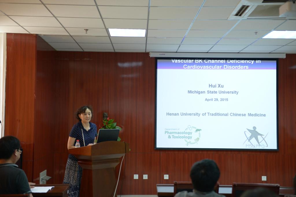 2015年4月29日下午3点,美国密执根州立大学药理毒理系徐晖博士应邀为我校第六届仲景文化节暨百家论坛作学术讲座,基础医学院教师及研究生代表80余人到场聆听了讲座,讲座由基础医学院高剑峰副院长主持。