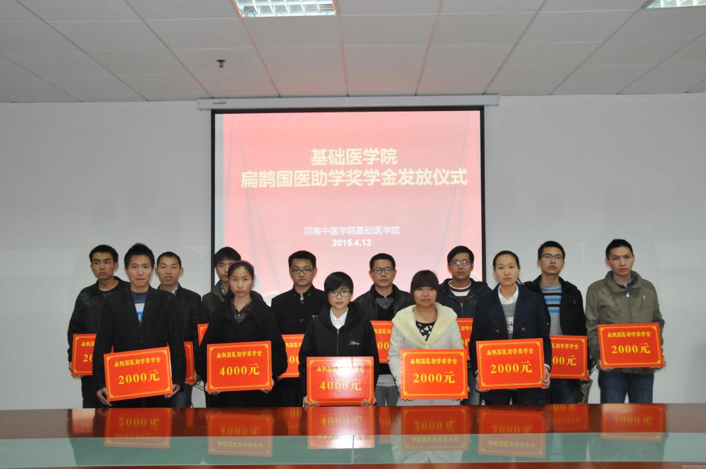 “扁鹊国医助学奖学金”由郑州中坤电力有限公司在河南hjc888黄金城老品牌中医学专业(仲景学术传承班)设立,意在弘扬祖国中医药文化的传承和发展,倡导学生学习之正气,励行奉善行道、帮扶助人之美德,主要用于资助仲景学术传承班成绩特别优异、家庭困难的学生。