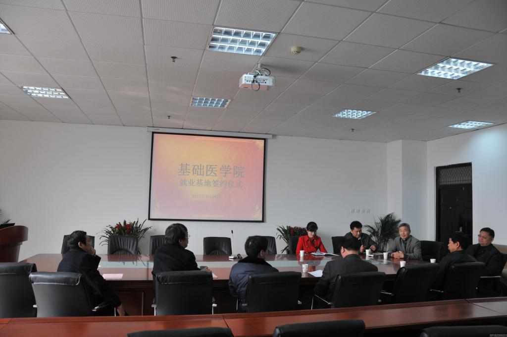 马相奇书记首先在签约仪式上致辞。他代表基础医学院向两家医院参加我校招聘会表示欢迎,对长期以来为基础医学院学生提供良好的就业及实习机会表示感谢,并希望通过此次实习就业基地的正式建立,进一步加强我校与社会用人单位的沟通,了解社会需求,不断优化大学生人才培养方向,为大学生的职前培训、实习锻炼、促进转变就业观念等方面提供更多服务和指导,不断推进基础医学院大学生就业工作。曹珊副院长与李肇进副院长分别简要介绍了基础医学院目前的学生人才培养情况及2015届各专业毕业生的情况,与参会医院深入交流与了解我校往届毕业生的工作情况,以及院方对所需人才的各项要求。最后,马相奇书记分别与两家医院共同签署了《基础医学院实习就业基地协议书》。