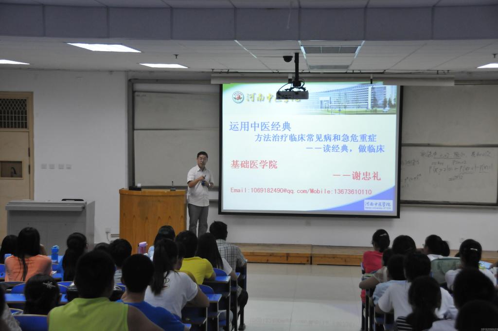 2014年9月26日晚7点,河南省中医药学会仲景学术委员会秘书长,基础医学院中医临床基础学科谢忠礼博士,应基础医学院邀请在教学楼A434教室作关于“运用中医经典方法治疗临床常见病和急危重症”的主题讲座。仲景班全体学生及我校共计三百余人参加了到场聆听。